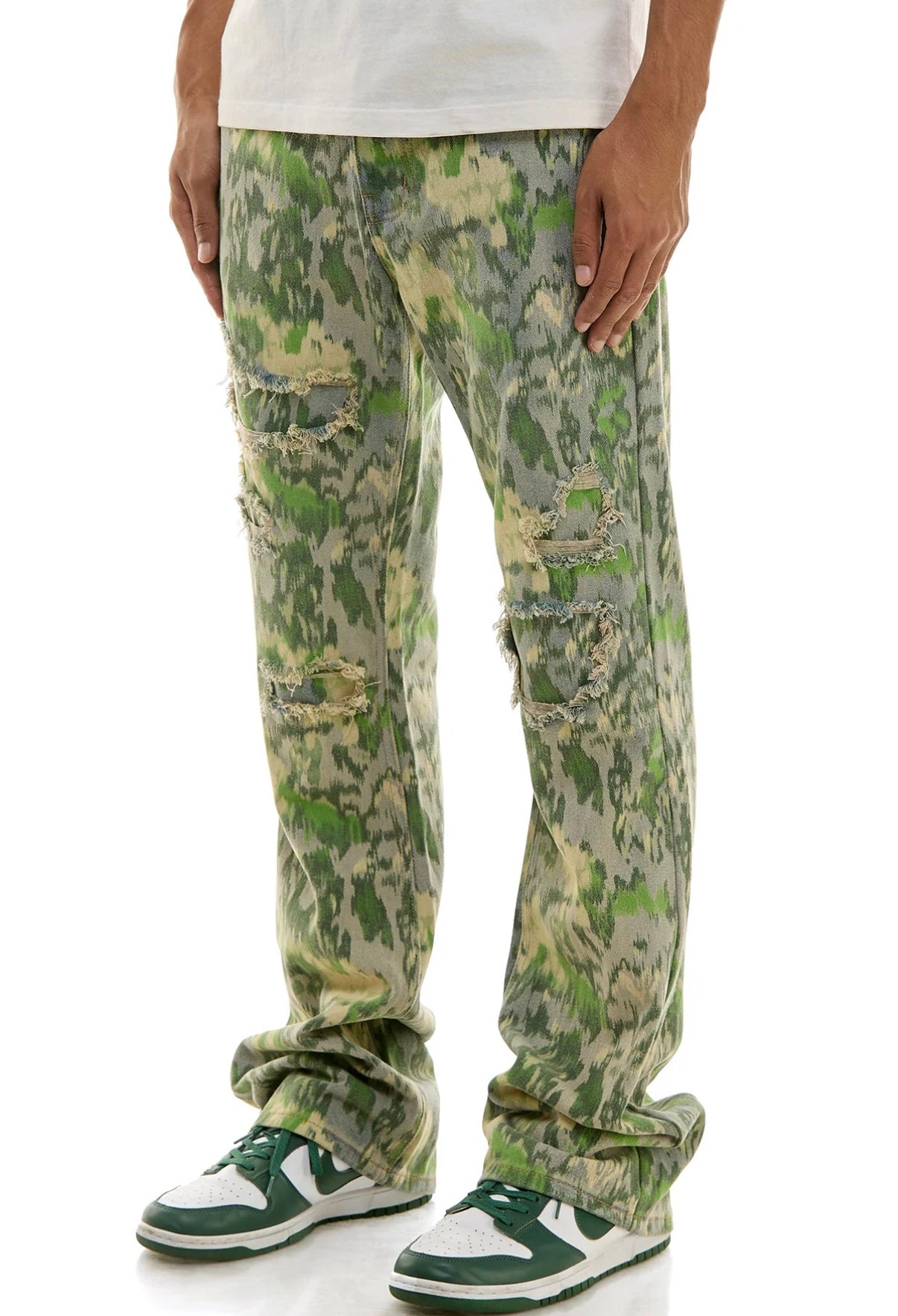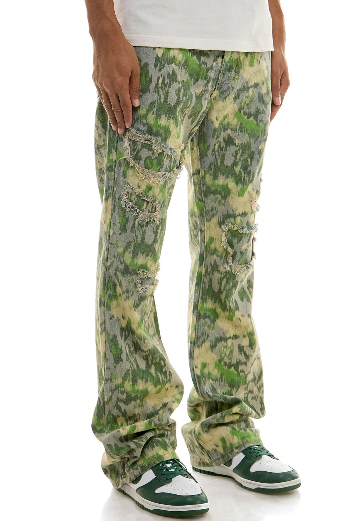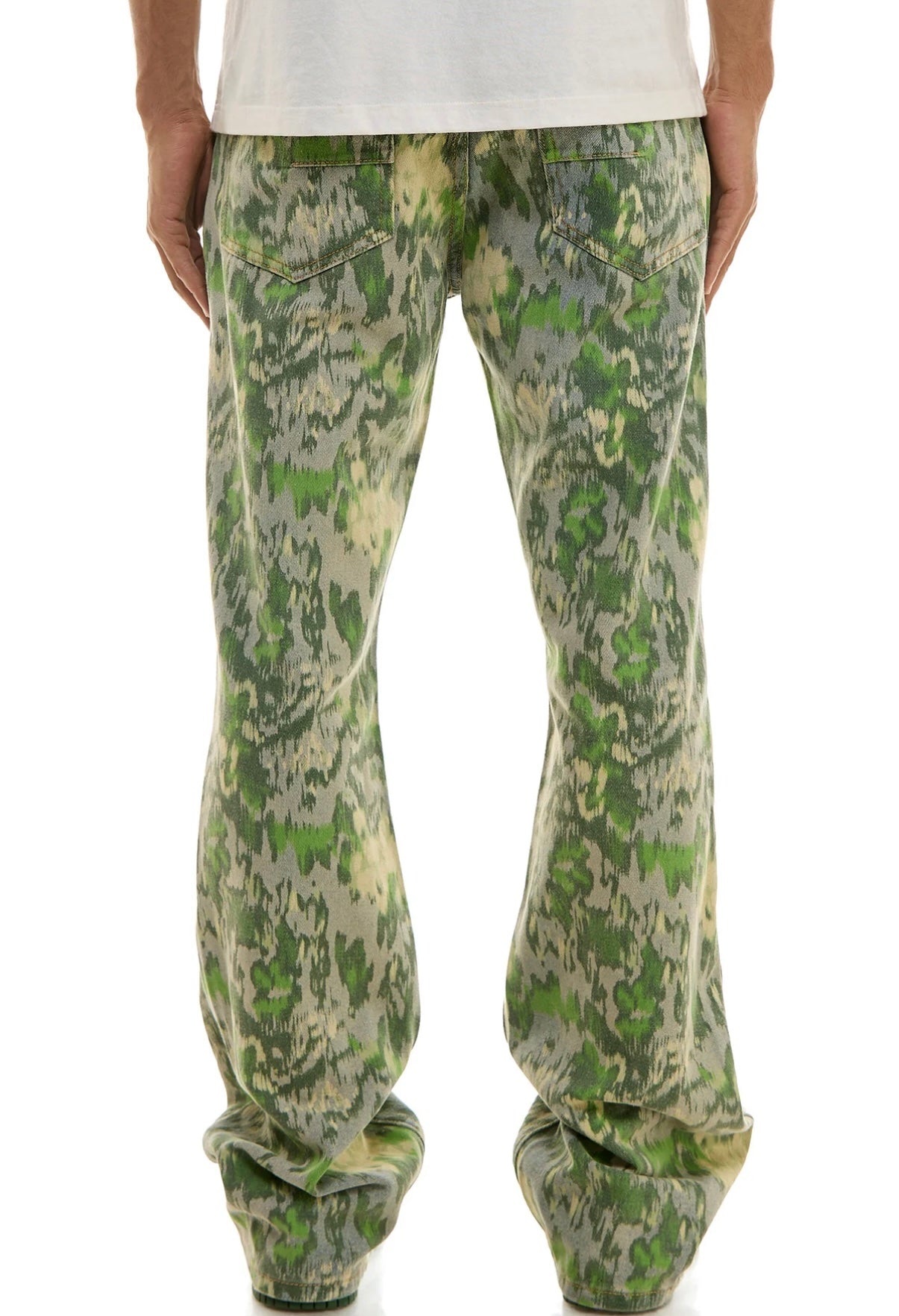 Stacked slim flare jeans in non-stretch special camo-washed denim